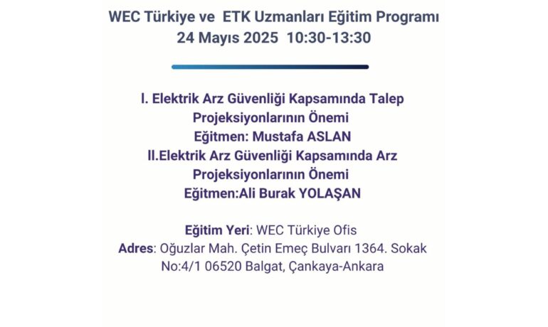 WEC Türkiye & ETK Uzmanları Derneği Elektrik Arz Güvenliği Kapsamında Talep ve Arz Projeksiyonlarının Önemi Eğitimi Detaylar