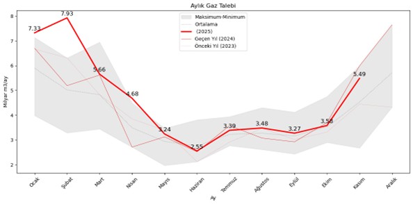 Bu ayki ana tartışma grafiğimiz gaz talebinde sıcak bir 2025 Kasım ayının çok soğuk bir 2024 Kasım talebine yakın seyretmesi oldu. Gaz talebi sürprizlerle doludur. Davranışsal etkiler vardır. Yani mesela erken gelen bir soğuk ile geç gelen soğuk talebi farklı etkileyebilir. Burada Kasım talebinin 2023’ün çok üstünde gerçekleşmesi, talebin güçlü seyredeceğinin işareti olabilir. Bunun temel belirleyicilerinden biri de fiyat esnekliğinin düşüşü olarak değerlendirilebilir. Fakat Kasım talebinin 2024-2025 farkının düşük olması, petrol sonrası gaz talebinde de yapısal bir artış göstergesidir.