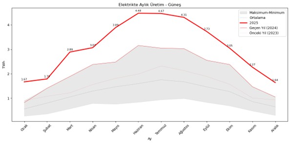 Güneş üretiminde çok olumlu bir yılı geride bırakırken, güneş üretim artışının Mayıs-Eylül döneminde daha da yüksek olduğunu yıllık grafikten görebiliyoruz. Fakat bu sene Aralık üretiminin sene başındaki Ocak üretimine çok yakın olması biraz kafa karıştırıcıdır.