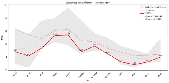 Hidroelektrik üretiminde “kontrollü üretim” rejimi diyebileceğiz, gaz ve talep ile üretimin dengelendiği 4 aylara girdik diyebiliriz. İlk etapta hidroelektrik üretiminin tekrar uzun yıllar ortalamasına yaklaştığı bir Aralık ayı gördük. Ama kurak yılda hidroelektrik üretiminin neye benzediğini gösterdiği için bu grafik önemli. Kurak da olsa, yıl zirvesi Nisan-Mayıs’ta gerçekleşti. Dip ise Ekim ayında görüldü.