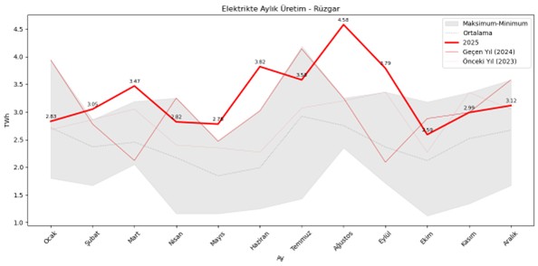 Rüzgarda bu sene artan kurulu güç ile birlikte, 12 ayın 6 ayında aylık rekorlar kırıldı. Özellikle Ağustos ayındaki 4.58 TWh uzak ara en yüksek aylık rekor olarak tarihe geçti. Rüzgar dip olarak da 2.6 TWh/ay seviyesinin çok altına düşmedi.